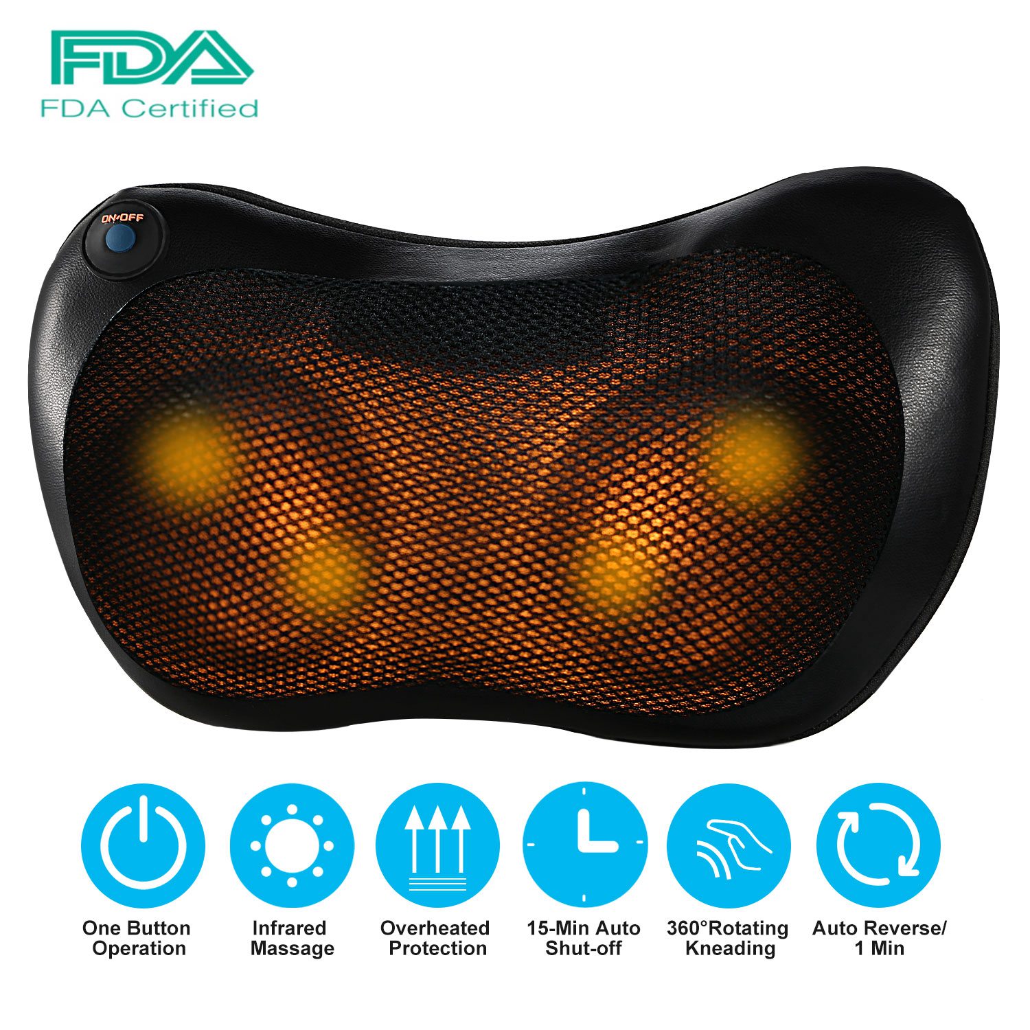 Are you suffering the sore of neck and shoulder due to the long seating working? Are you sored of muscles due to high-intensity sport? Are you feel back stiffness due to overtime driving? If yes, our neck massage pillow can help you. 15-Minute auto off and auto reversible directions. With Kneading and Tuina 2 massage mode, adopts infrared warming technology to provide a soothing and invigorating heat that delivers a warm and gentle massage to boost blood circulations. Leave your muscles relaxed while getting rid of all aches and fatigue. Ergonomic design and easy operation to fit perfectly for your whole body and a superior gift for your coworkers, friends, parents and etc.. Can be installed on your car seat and your home chair.