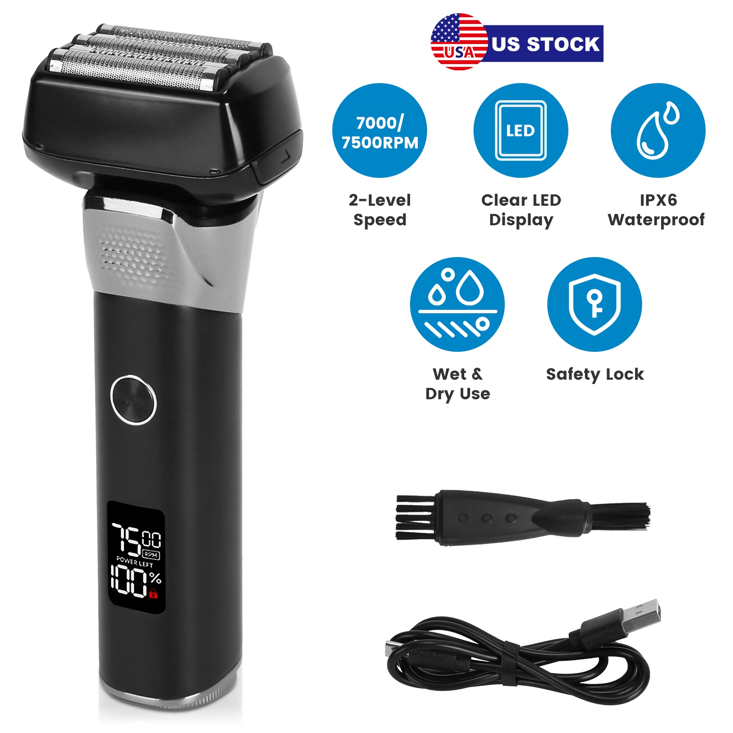 Achieve barber-quality shaves at home with this efficient electric trimmer featuring 5 titanium alloy flexible foil blades that effortlessly adapt to facial contours for an ultra-close, irritation-free shave—perfect for defining necklines, jawlines and sideburns. The convenient pop-up trimmer handles precise mustache detailing. Equipped with dual 7000/7500 RPM speeds ensure optimal performance for all hair types without nicks or tugging. Waterproof IPX6 construction allows wet/dry use with shaving gel or foam(not included), and the detachable head and included cleaning brush enable effortless maintenance. Enjoy 100 minutes of cordless runtime from the 2000mAh battery plus travel-safe locking functionality—ideal for both daily grooming and gift-giving occasions like birthdays or Father's Day, delivering professional results with unmatched convenience.